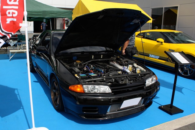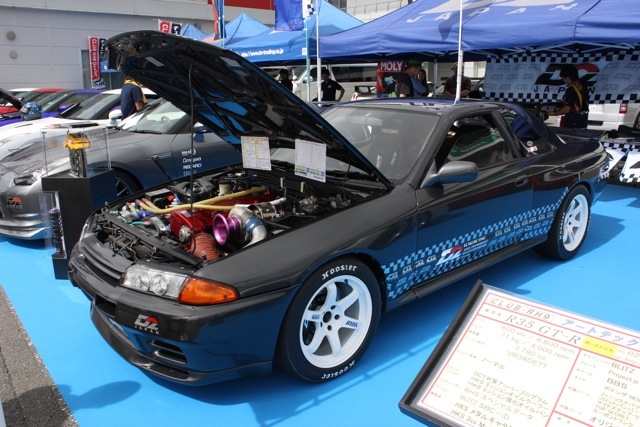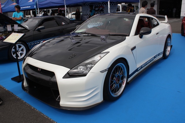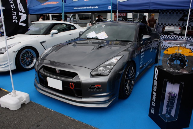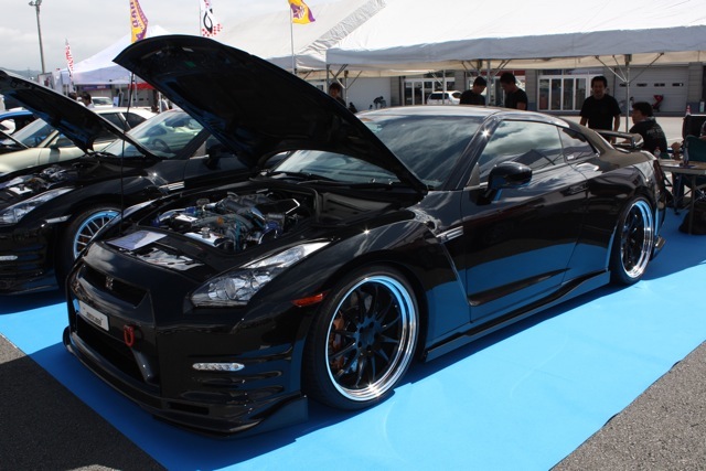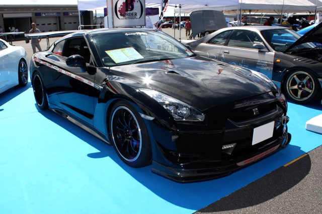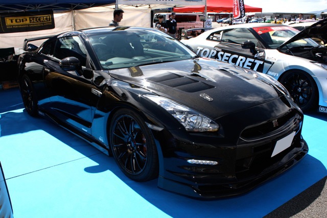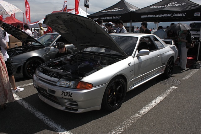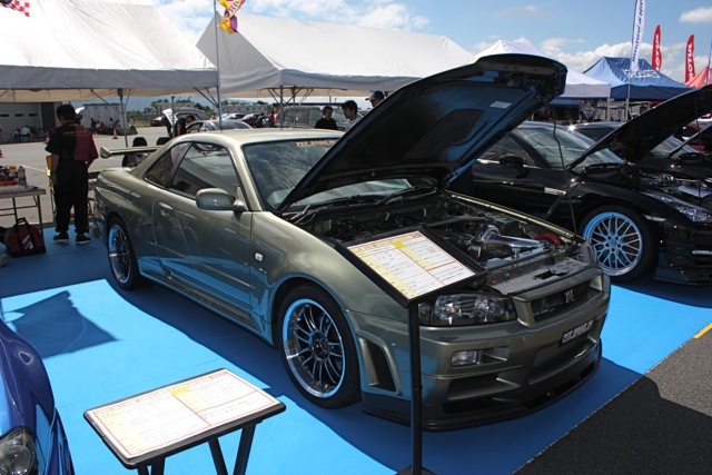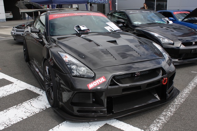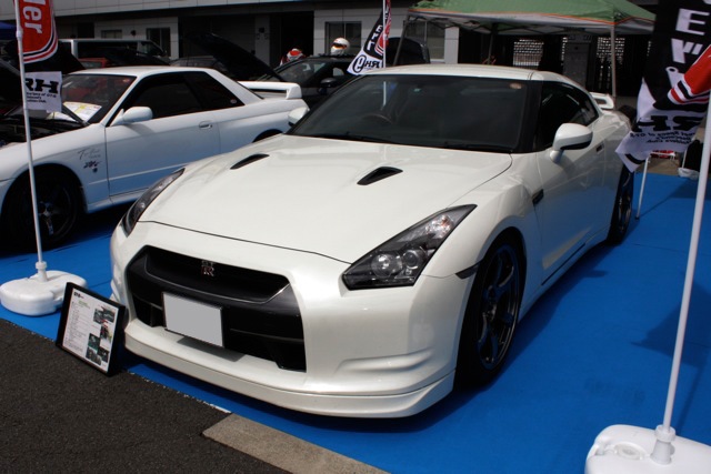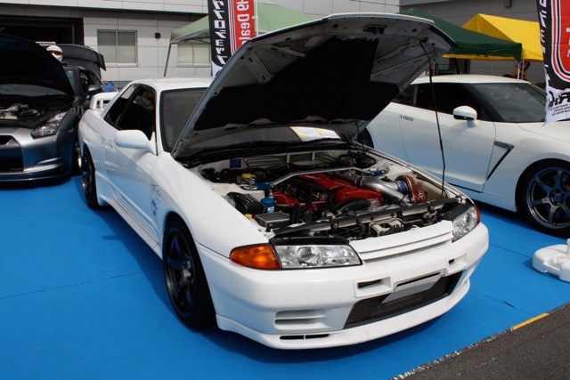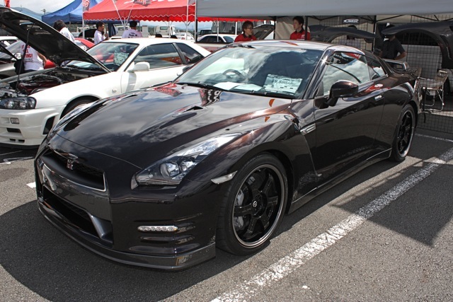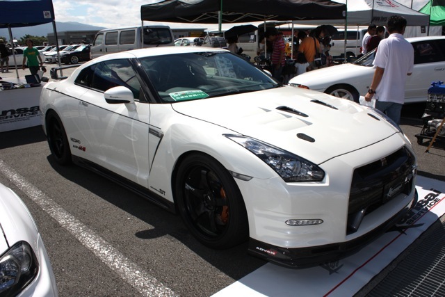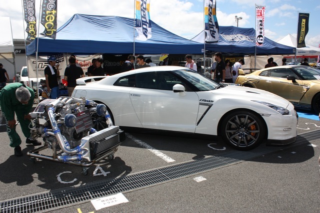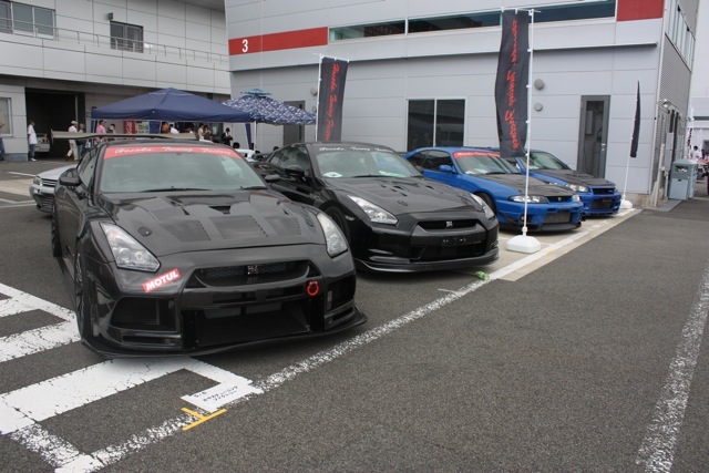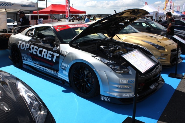 今回も沢山の出展やデモカーが展示。各ショップやメーカーのチューニングカーにGT-Rファンはくぎづけに!! イベントでは、パレードラン、SUPER GTで活躍するドライバーの荒聖治選手、松田次男選手によるトークショー、参加者によるフリー走行、観客の注目を一番集めたのは、富士のストレートを使用した、デモカーによるゼロヨンバトル。