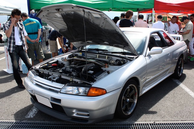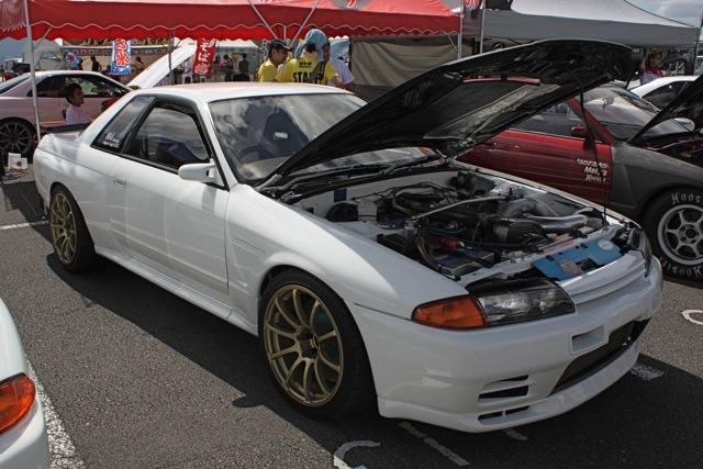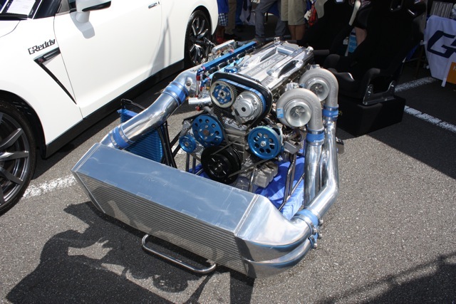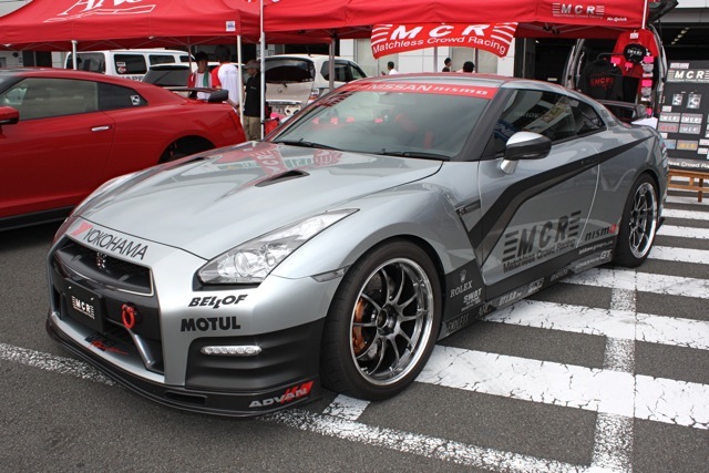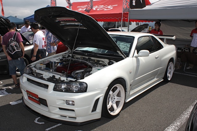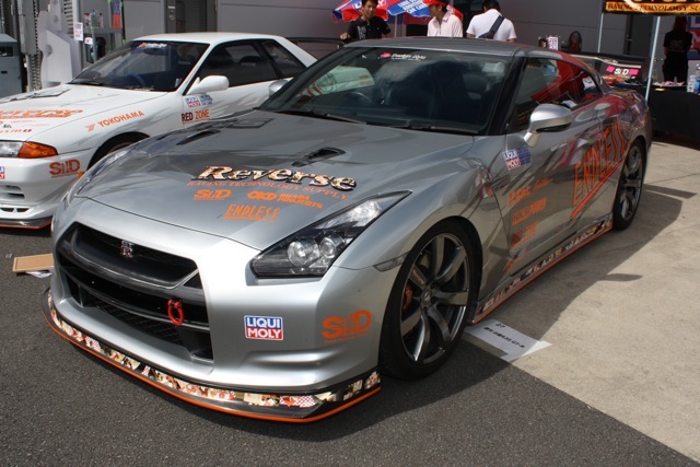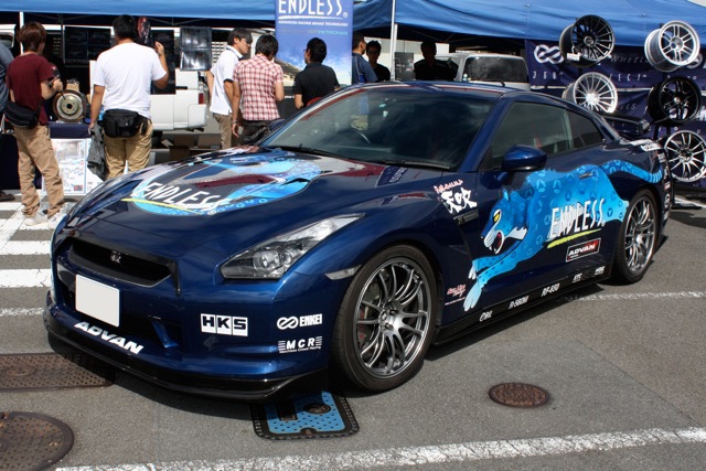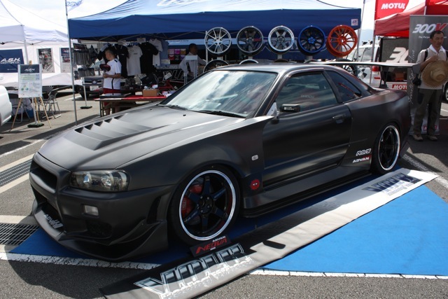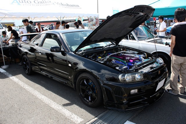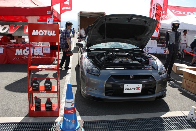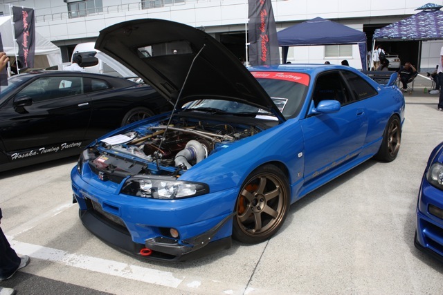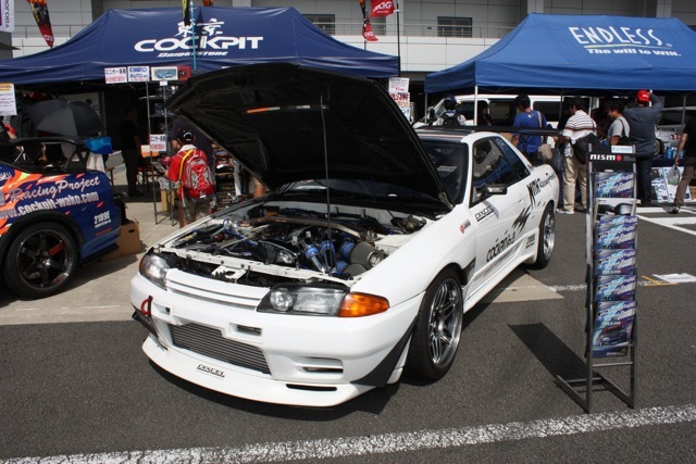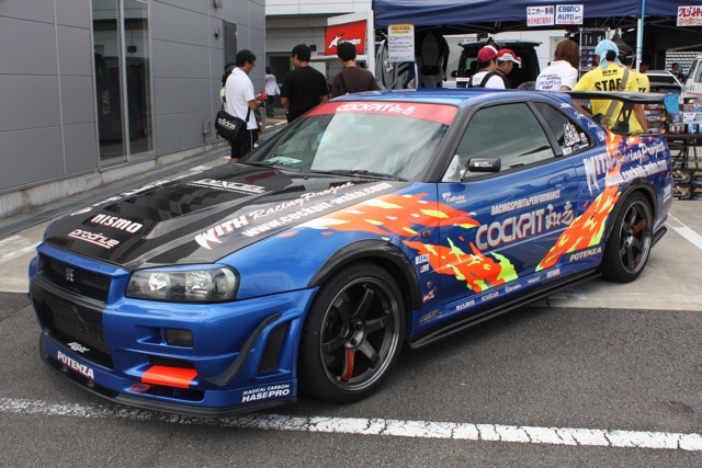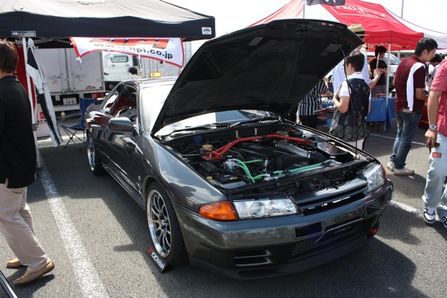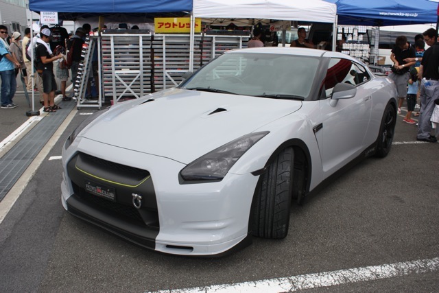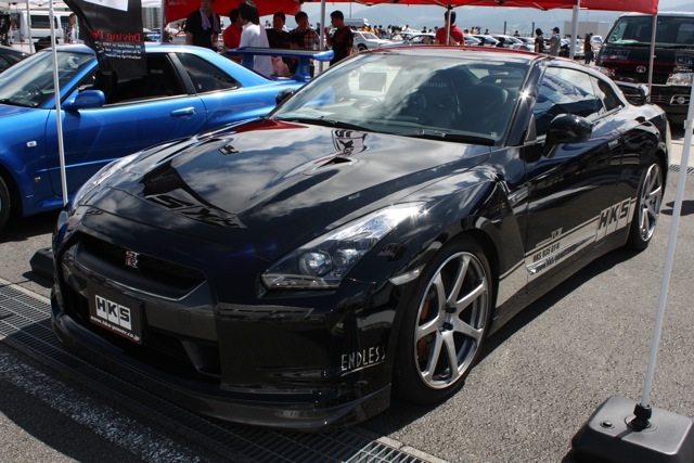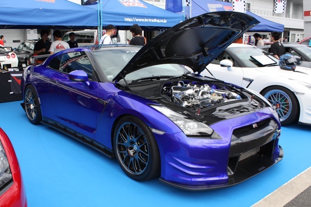 今回も沢山の出展やデモカーが展示。各ショップやメーカーのチューニングカーにGT-Rファンはくぎづけに!! イベントでは、パレードラン、SUPER GTで活躍するドライバーの荒聖治選手、松田次男選手によるトークショー、参加者によるフリー走行、観客の注目を一番集めたのは、富士のストレートを使用した、デモカーによるゼロヨンバトル。