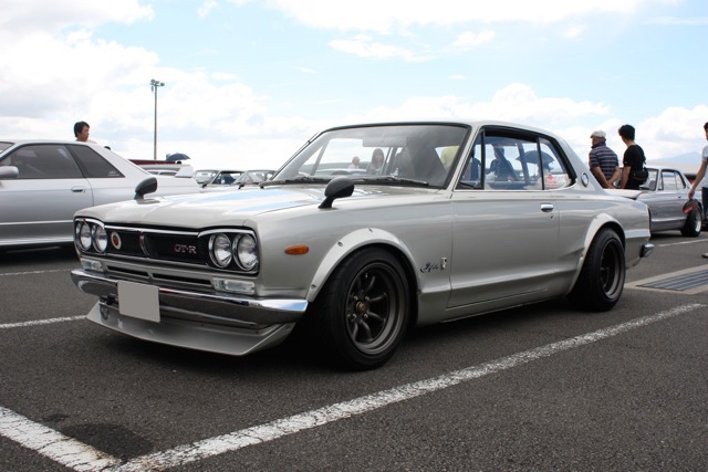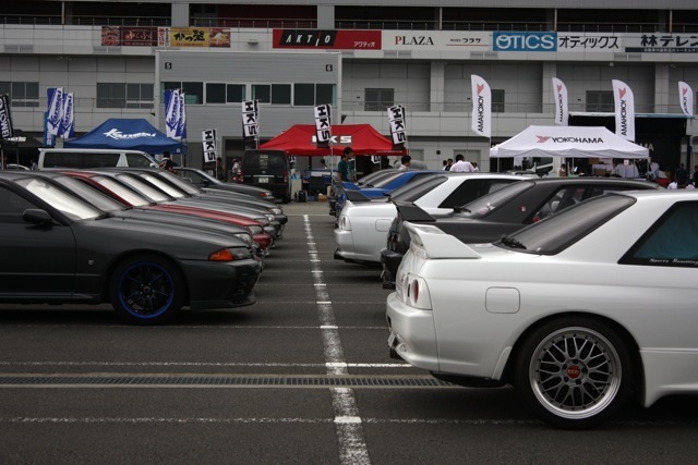パドックの駐車場には、歴代のGT-Rごとに駐車スペースが区切られ、昨年も展示された32GT-Rのレーシングカーにカラーリングされた車両や、メンテナンスのいきとどいたハコスカなどを前に記念撮影をするギャラリーも沢山。
