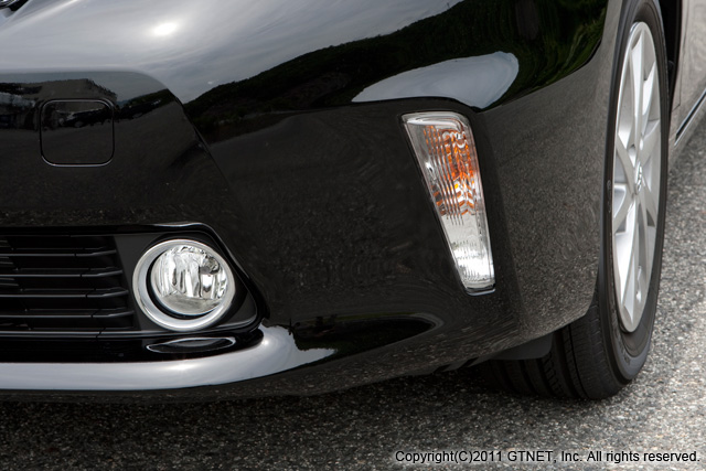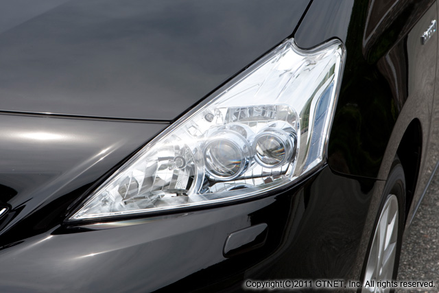 第一印象は、デカイ!。フロントマスクのイメージこそプリウスと共通だけれど、すべての外装パーツはプリウスαのためだけに専用設計されたオリジナルになる。槍型をイメージしたヘッドライトも専用品で、バンパーやボンネットも、中央部のエンブレムが大きく盛り上がる造形に仕上げられ、ダイナミックかつ躍動的なデザインに進化した。ヘッドライトはG系が全車LED、S系はツーリングセレクション以外はハロゲンとなる。Cd値0.29はクラストップレベルだ。