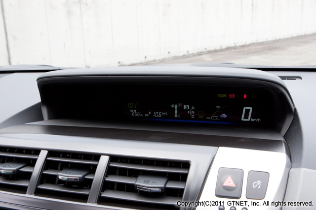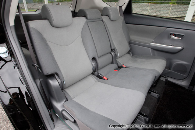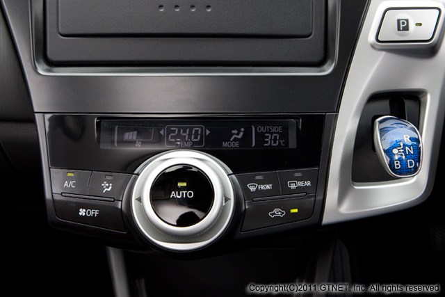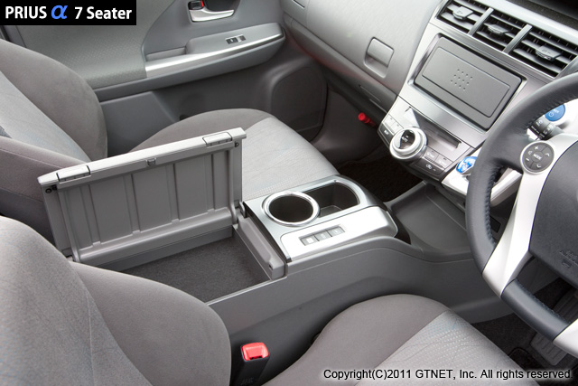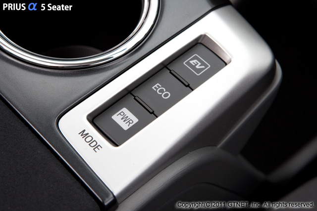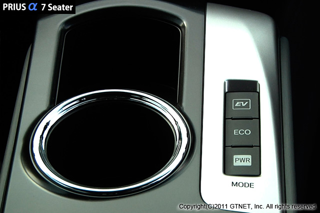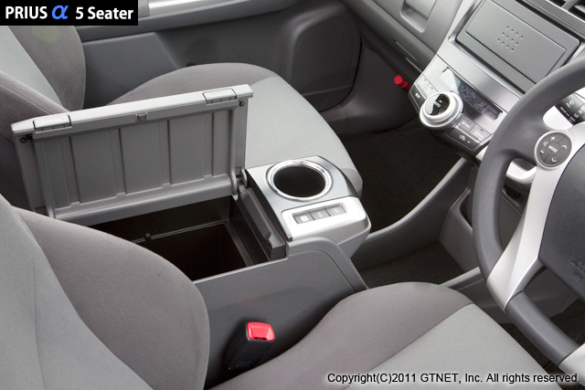 インテリアは、ダッシュボードやメータパネルのデザインも含めて、すべてプリウスαのために専用設計された。ダッシュボードは水平基調の左右対称デザインをベースに、プリウスをイメージした楕円ステアリングやセンターメーターを継承しつつ、完全オリシナルデザインを施すことで開放感のある広々とした空間を演出する。中央部のワンダイアルエアコンコントロールは、1つのダイヤルで設定温度、風量、吹き出し口の選択などを瞬時に変更できる優れもの。メーターデザインは、初代プリウスから採用されてきたエネルギーモニターが廃止(ナビ画面で表示可能)され、ハイブリッドインジケーターを中心にエネルギー状態をシンプルかつ直感的に表示する。3種類の走行モード(ECO/PWR/EV)や、エレクトロシフトマチックセレクターなど、プリウスで確立された操作性は踏襲する。座面高はプリウスよりも30mm高く、ミニバンテイストの見下ろす感じに変更された。同時にヘッドルームも高くなっているので、快適なヘッドクリアランスを確保する。