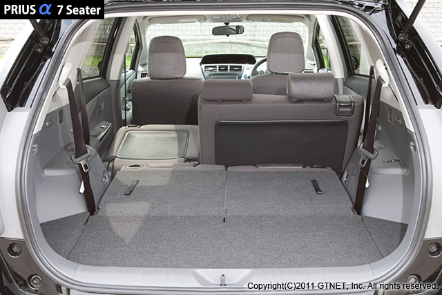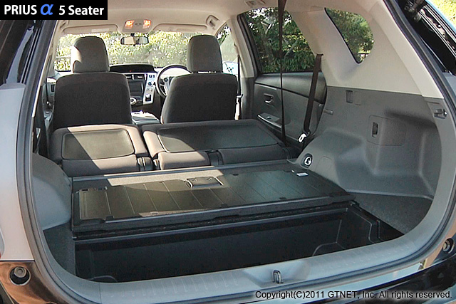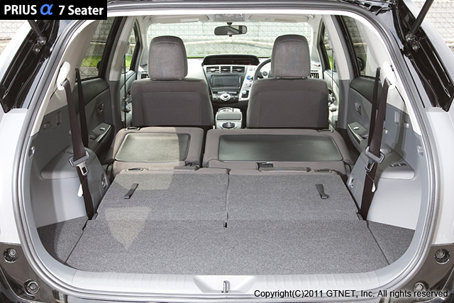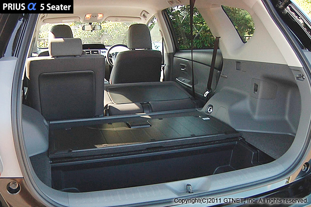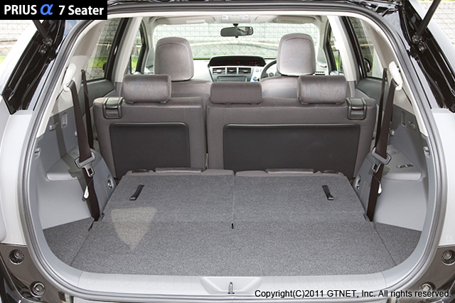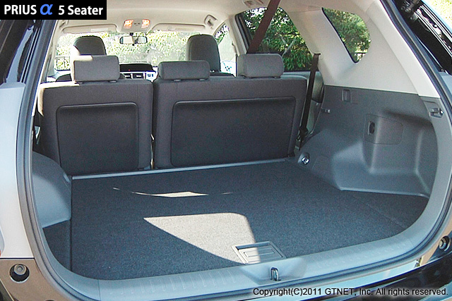 プリウスα5人乗りモデルの荷室は、大容量533リットルを実現し、プリウスに比べて195リットル分増加した。また、2列目の6:4分割可倒式シートを前に倒せば1,850mmのフラットフロアが出現。長尺の荷物を載せたい場合や沢山の荷物を載せたい時、バン的に使いことも可能だ。プリウスαは緊急用スペアタイヤが廃止され、荷室のフロア下にも収納スペースを確保。パンクした際には付属のパンク修理キットで対応することになる。7人乗りモデルの場合も、3列目の5:5分割可倒式シートを床下に収納すれば5人乗り同等の荷室スペースを確保することができる。