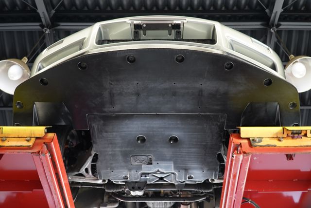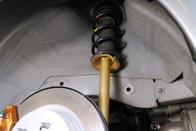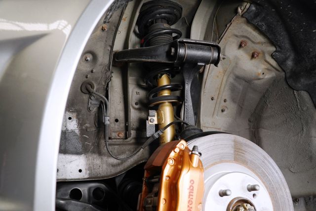 足廻りは、純正サスペンションと純正ブレンボキャリパーが付く。キャリパーは、発熱による変色やクリア塗装の剥がれも無く、美しいルックスをキープ。ドライブシャフトやタイロッドエンドのゴム製ブーツの状態も良好で、現状のままで車検をクリアできると思われます。