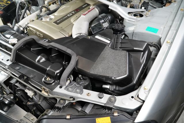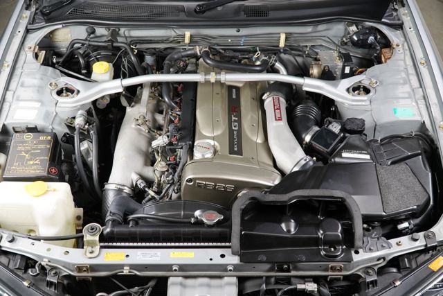 ボンネットを開くと、ゴールドの特別塗装が施されたN1仕様のエンジンが搭載。タービン、エキマニ、触媒、マフラーなどの排気系はすべてノーマルのままで、吸気系は純正エアクリーナーボックスが付いていますが、インタークーラーはHKSの大容量タイプに交換されています。エンジンやミッションからの油漏れはなく、コンディションは良好です。