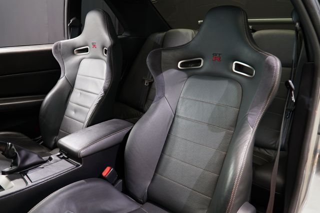 インテリアで注目すべきは、本革シートの採用だ。ショルダー部分にサポート性を高めるバックスキン生地(エクセーヌ)を配置し、職人による手縫いによって1脚ずつ丁寧に仕立てられた逸品だ。また、運転席及び助手席のバックレストには「GT-R」の刺繍が入り、ヒーターを内蔵。ステアリングも標準車の370mmに比べて若干大きい373mmに大径化されている。メーターパネルは、300km/hフルスケールメーターに変更され、ノーマルとの差別化が図られている。