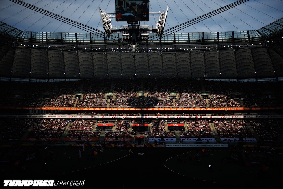 フォーミュラドリフトとまったく違って感じたのは、2日目の“スケール感”だ。スタジアムをぐるりと埋め尽くす観客、その圧倒的な広さと熱気に、鳥肌が立った。言葉では言い表せない――写真ですら、この臨場感の半分も伝わらないだろう。