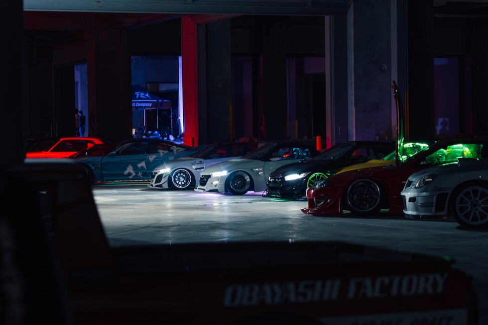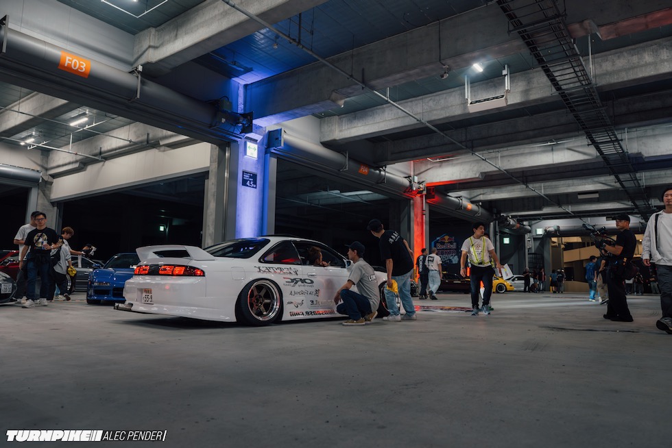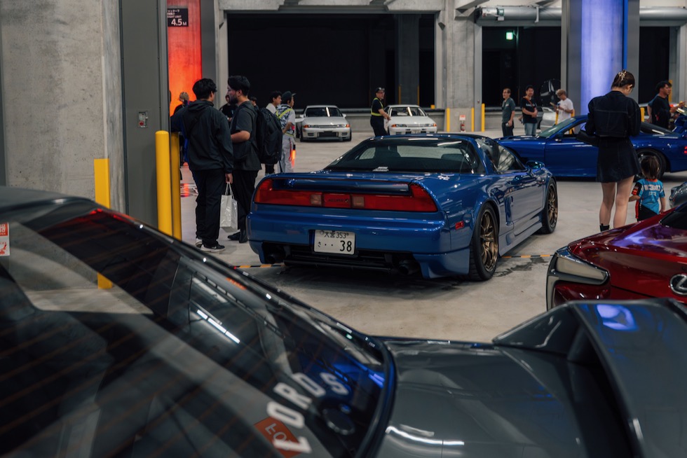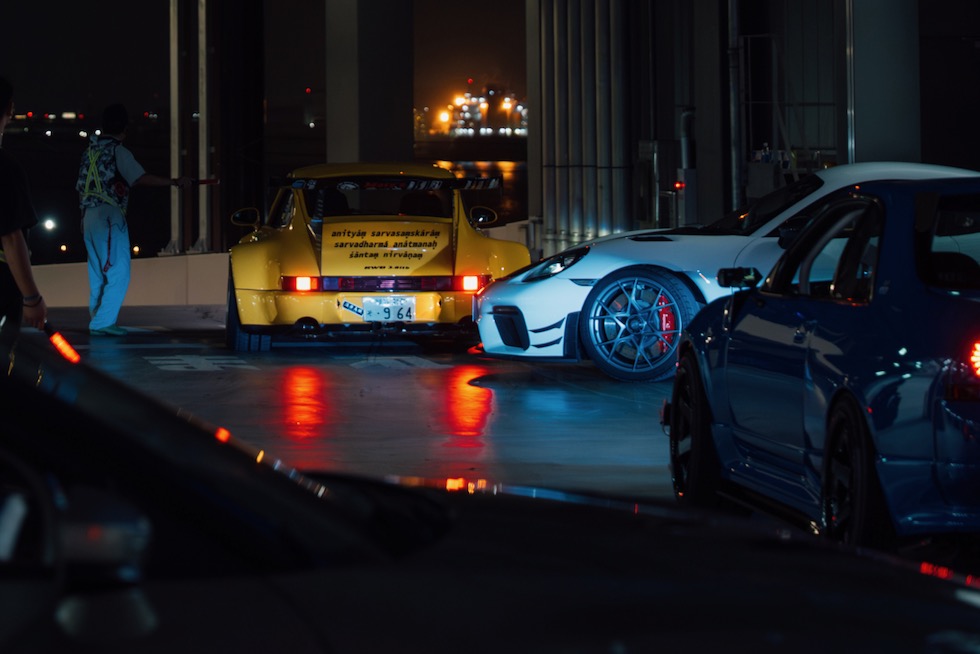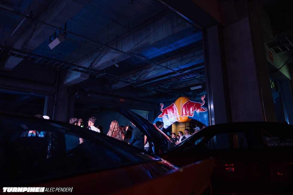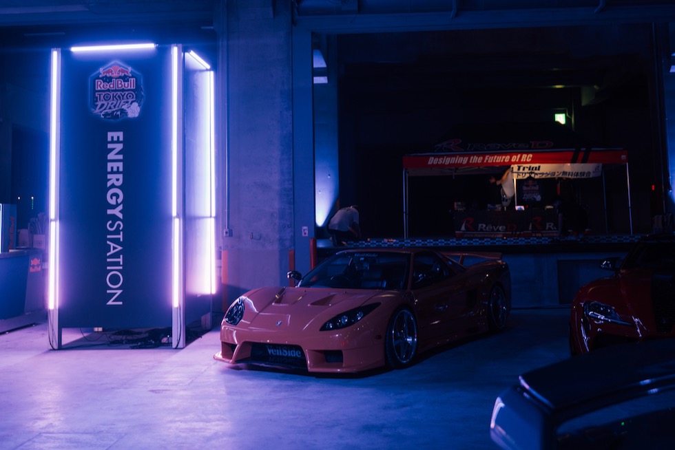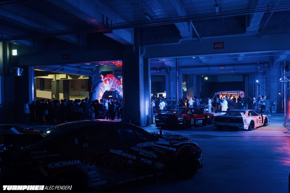 コンクリートの立体迷路を、ストロボとLEDストリップ、そしてレッドブルのサインが照らし出す中を進んでいく。3階にたどり着いた瞬間、そこが“現場”だとすぐに分かった。チューニング車の海を抜け、ビートを刻むDJブース、フードやドリンクの屋台、見覚えのある顔ぶれが手を振りながら出迎えてくれる。そして俺たちは、あらかじめ割り当てられたスポットへと案内された。