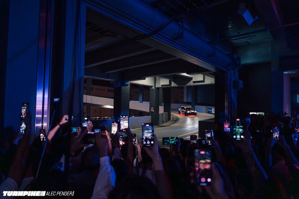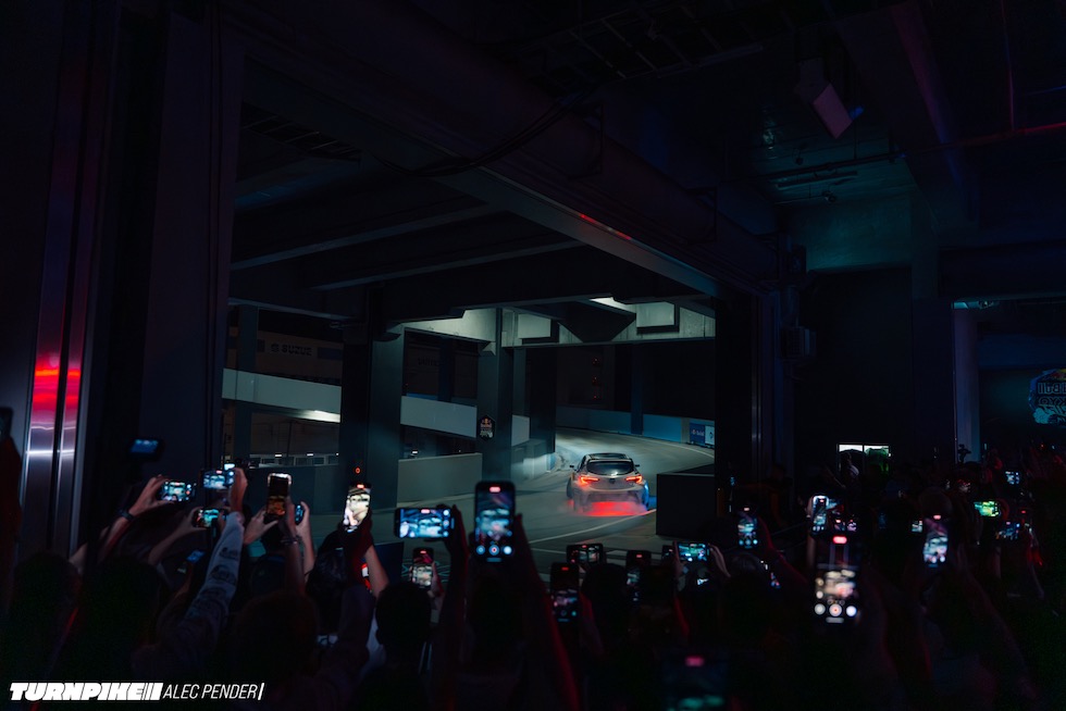 姿を現したのは、マッド・マイク・ウィデット。TCPマジックが手がけた4ローターのマツダ3からは、まるでドラゴンのように炎が吹き出す。そのすぐ後ろを、わずか15歳の箕輪日向が、クスコ製2JZ搭載のトヨタGRカローラで追従。まるで映画のワンシーンのように、2台は倉庫のランプをフロアごとに華麗なタンデムドリフトで駆け上がっていく。まるで『ワイルド・スピードX3 TOKYO DRIFT』そのもの――いや、それよりもずっと生々しく、爆音で、リアル。ヤバすぎた。