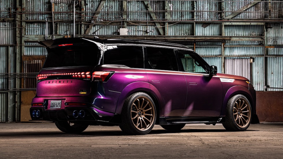 外観もパワーにふさわしく過激だ。GT-R T-Spec Takumi に着想を得たワイドボディは、ARP フロントスプリッター、SUV の頂上から突き出す巨大リアウイング、専用バンパー&サイドシルで構成される。ボディカラーは R34/R35 で伝説となった“ミッドナイトパープル”由来のラップ。カスタムディフューザーと、R35 を思わせるエキゾーストフィニッシャーも装備され、QX80 は完全に“GT-R 的な別物”へと姿を変えている。