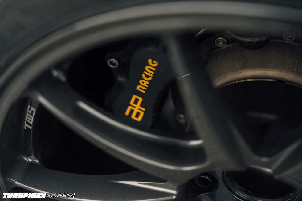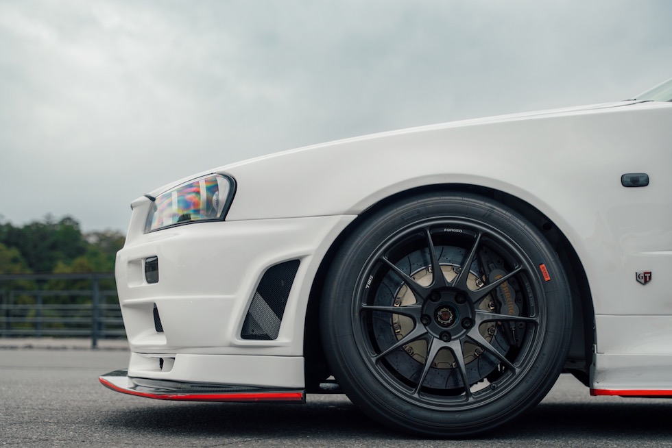 TWSの鍛造ホイールに、ADVAN A060のスリックを組み合わせ、その奥にはAP Racingのブレーキ。しかも、バネ下を極限まで減らすために位置まで最適化されている。こういう「誰が気づくんだ」という執念こそ、ビルダーの本気度を物語るディテールであり、このR34がただ者ではない理由だ。