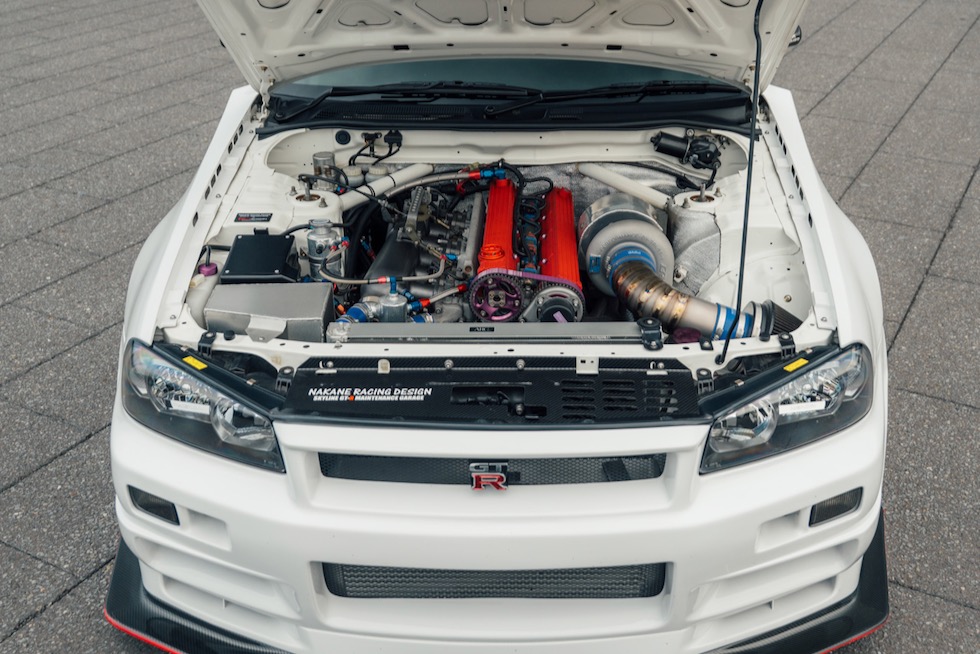 吸気は、鋳肌を磨き落とした Nismo GTプレナム。ストラットタワーバーは無し。その代わりに、フル溶接ロールケージと一体となった補強がボディ剛性を受け持つ。見せかけではない、本物の強度だ。