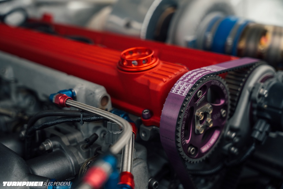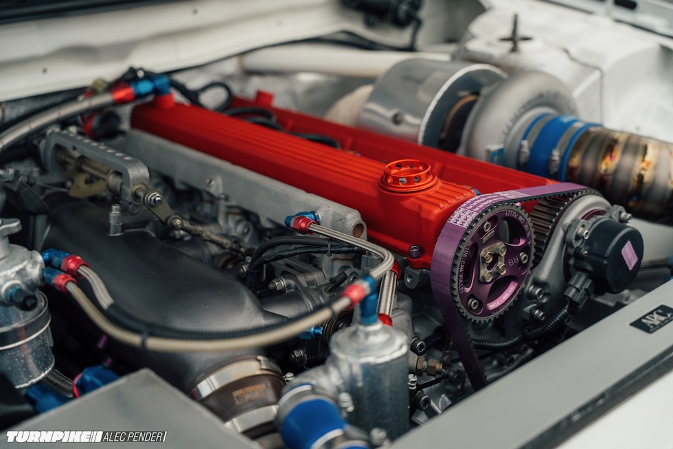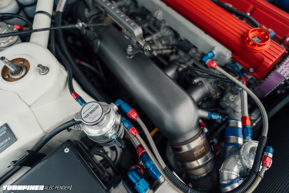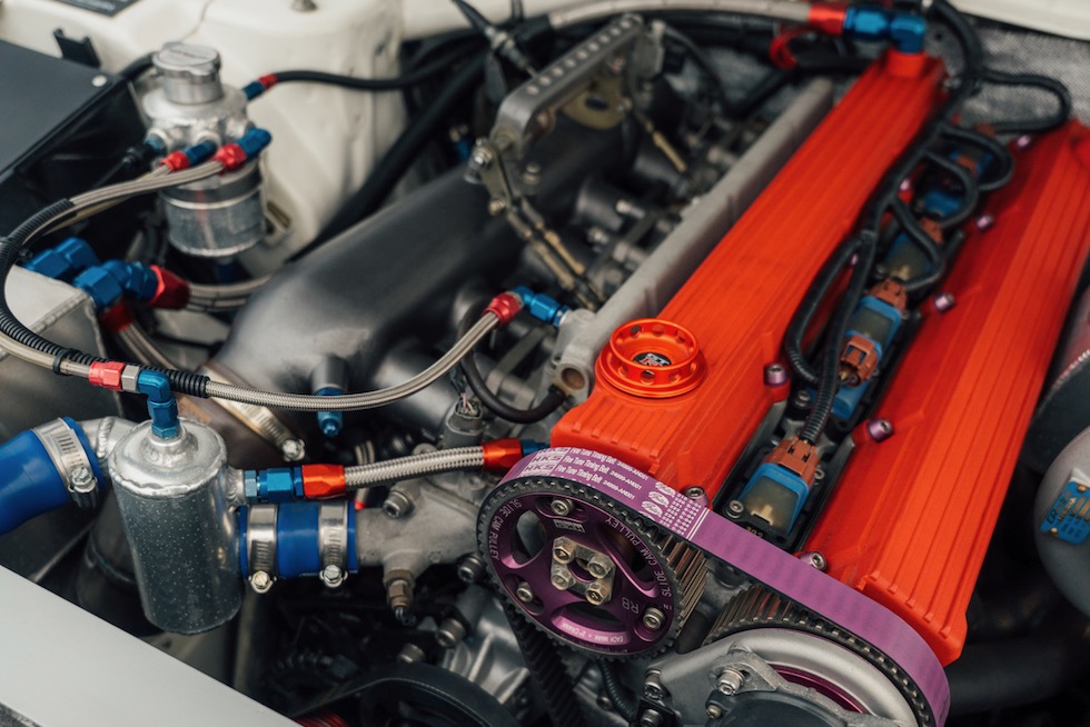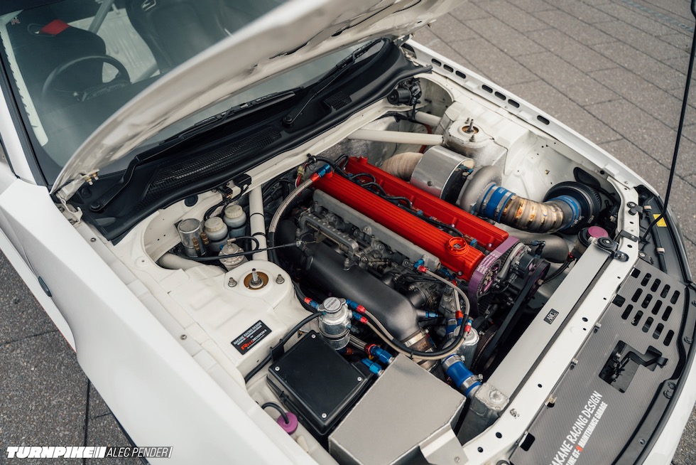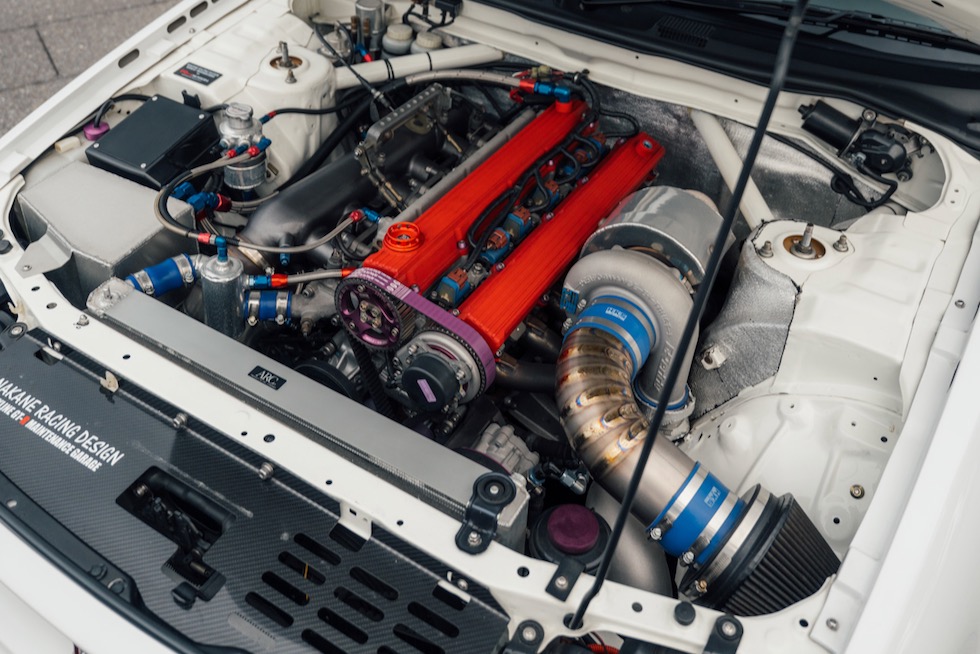 そして今回わざわざ日曜日を潰してまで足を運んだ最大の理由──Auto Gallery Yokohama(AGY)製 RB28エンジンが、その中心に鎮座する。ヘッドには AGYの代名詞ともいえる RB20カムカバー。ブロック内には HKSステップ3のストローカーキットが収まり、サイドにはGReddy T88-38GKのシングルターボ。サイド出口のエキゾーストへ一直線に吐き出すレイアウトは、どこかグループAを思わせる静かな狂気をまとっている。