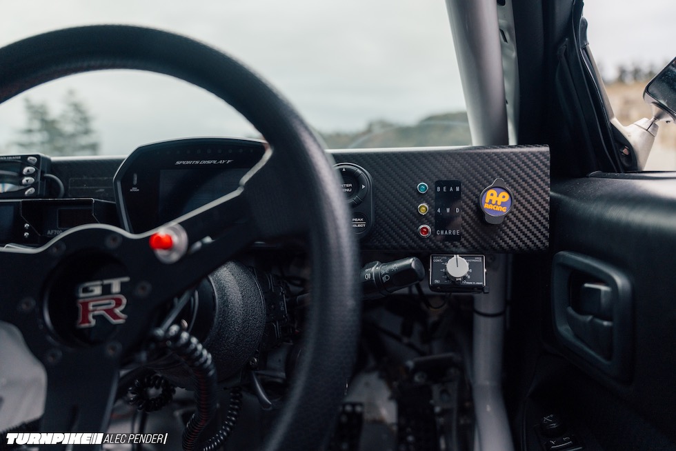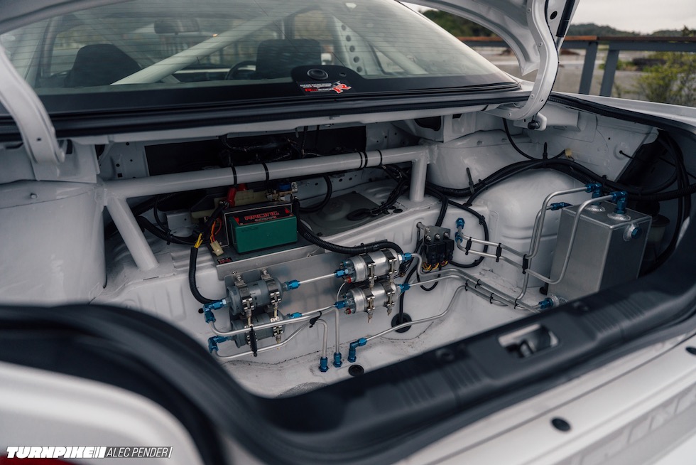 キャビンに入れば、このマシンの覚悟は一目瞭然。内装は剥がされ、ボディ同色のホワイトでペイント。配線はカーボンダッシュの裏に美しく隠される。運転席はBRIDE、助手席は純正R34、AP Racing のペダルボックス、そしてHKSの各種電子デバイス──すべてが走るためだけに配置されている。さらにトランクには、Bosch モータースポーツの燃料ポンプを二基、そしてサージタンク。こちらももちろん、機能最優先。