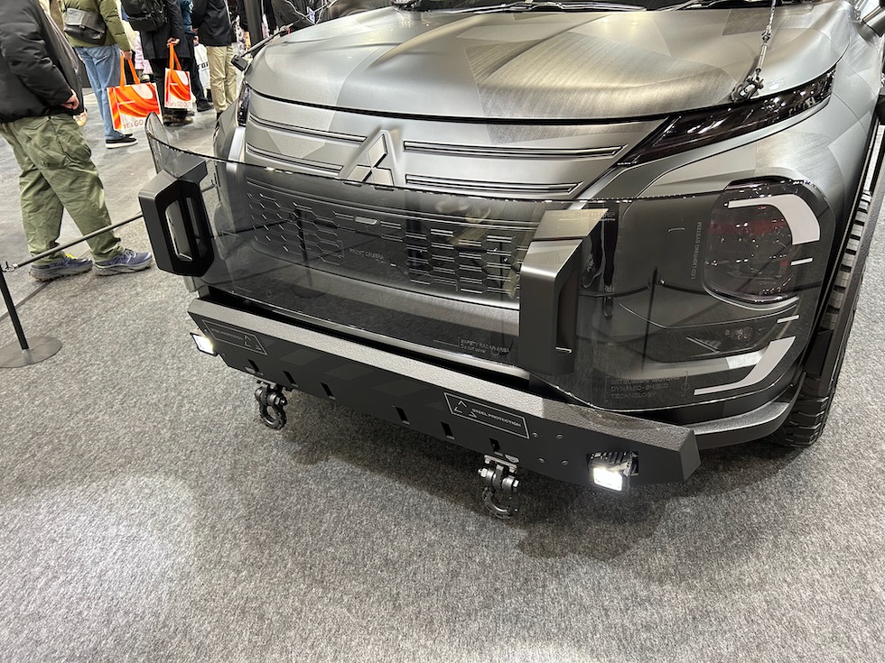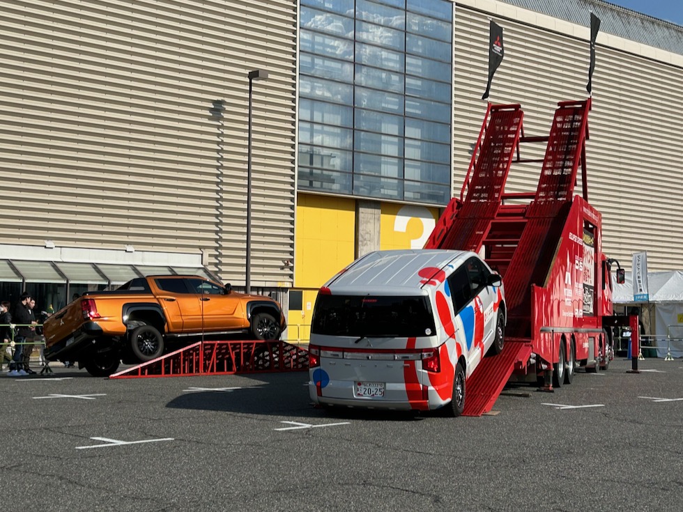 クロスオーバーSUVアウトランダーPHEVを人気ゲーム「メタルギア ソリッド」に登場することをイメージしカスタマイズした車両展示や、オートメッセではお馴染みの、急勾配に同乗走行体験も!