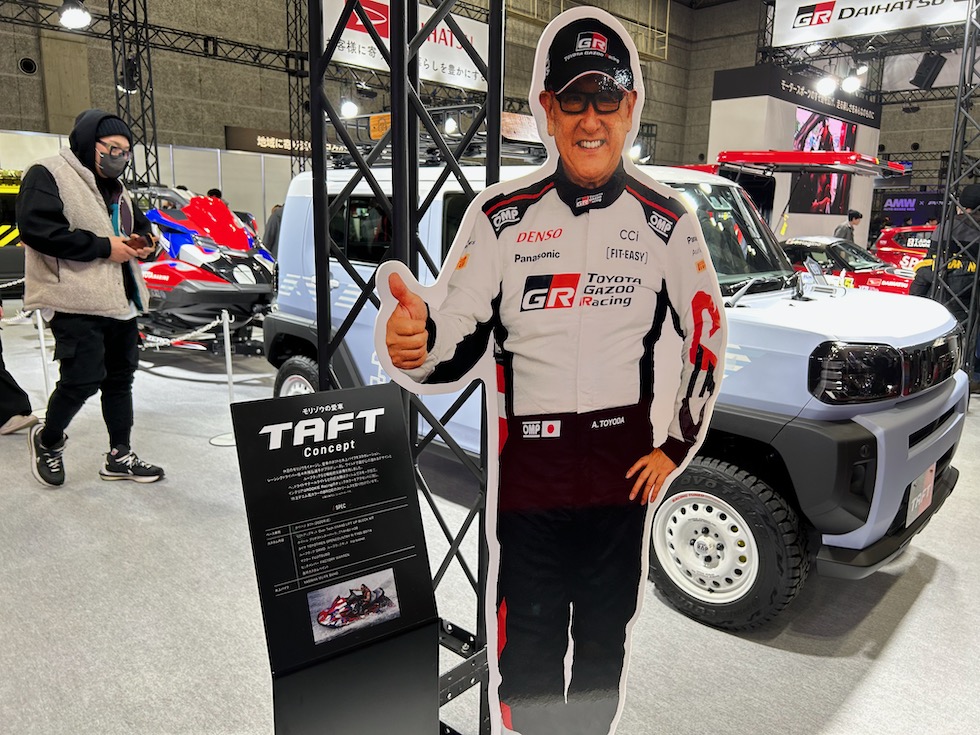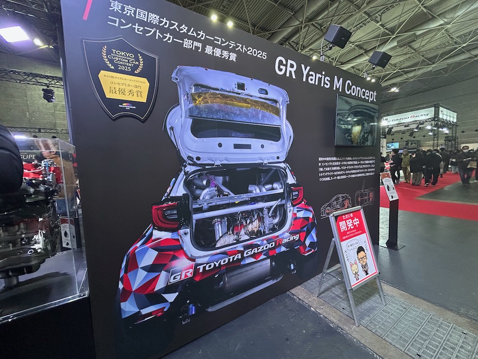 東京オートサロンで、注目を集めた4気筒2LターボエンジンをリアミッドシップにレイアウトしたGRヤリスMコンセプトは、生憎、開発テストのため展示はなかったが、来場者にお詫びするモリゾー会長の看板がユーモアだった。